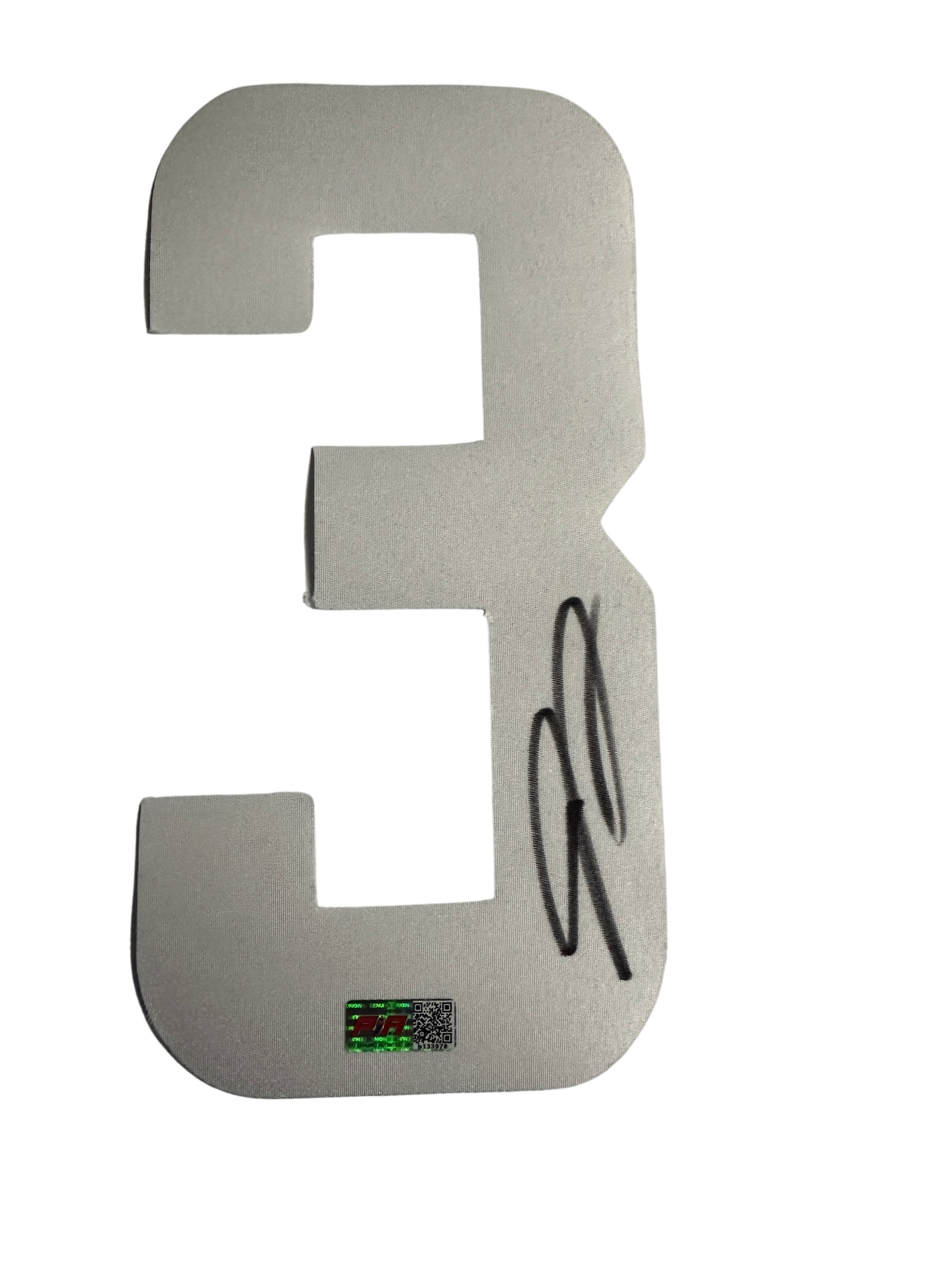 Autographed Tackle Twill Number. This item gets sewn onto a jersey.The item listed is the stock picture of the number you will get the same looking item. The autograph placement might be different in the number.