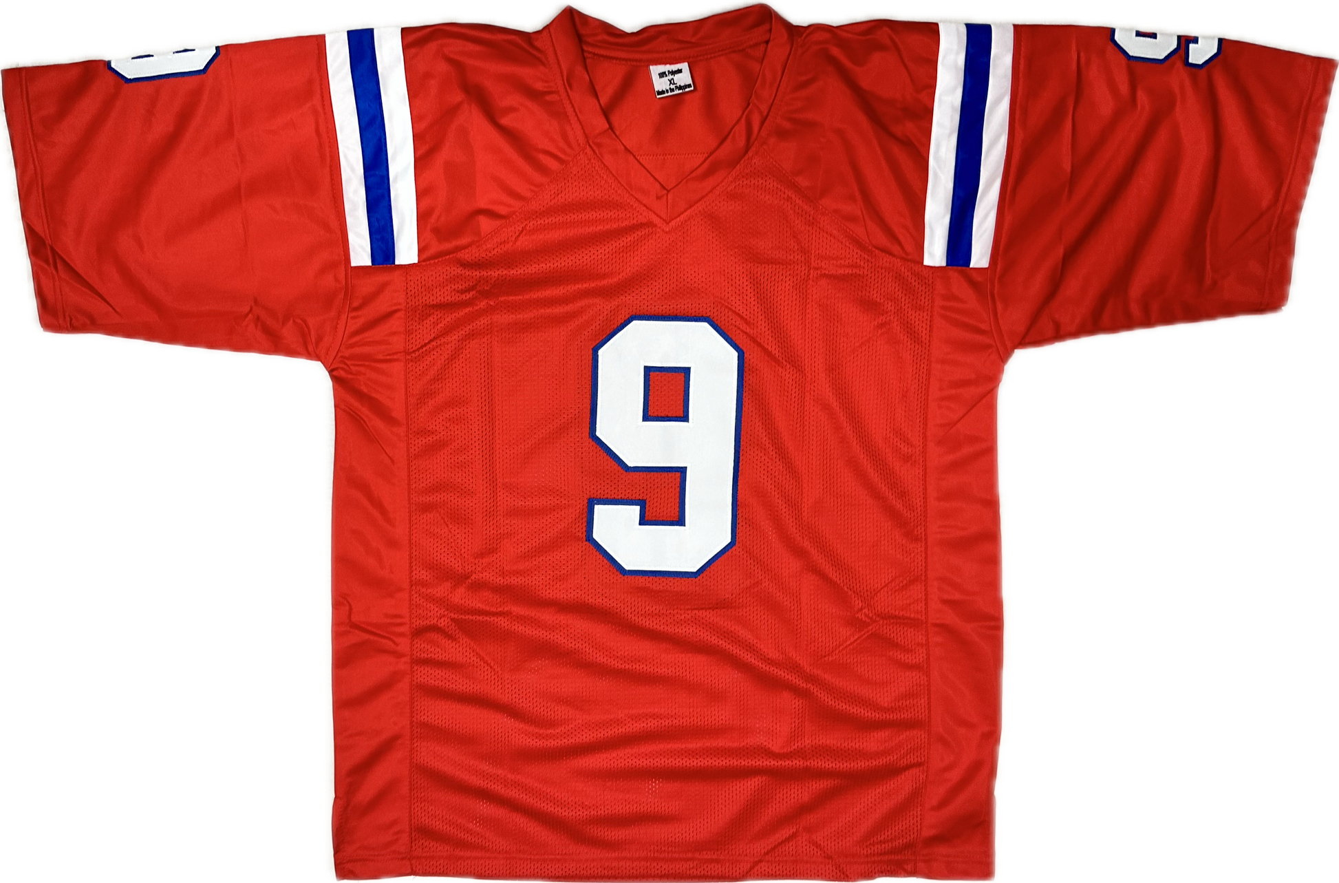 - A professional style custom football jersey with sewn on name and numbers. THERES NO TAGS ,NO LOGOS NO NFL MARKS on the custom jersey .The item listed is the stock picture of the jersey you will get with the same looking jersey and autograph placement might be different of autograph on the jersey.
